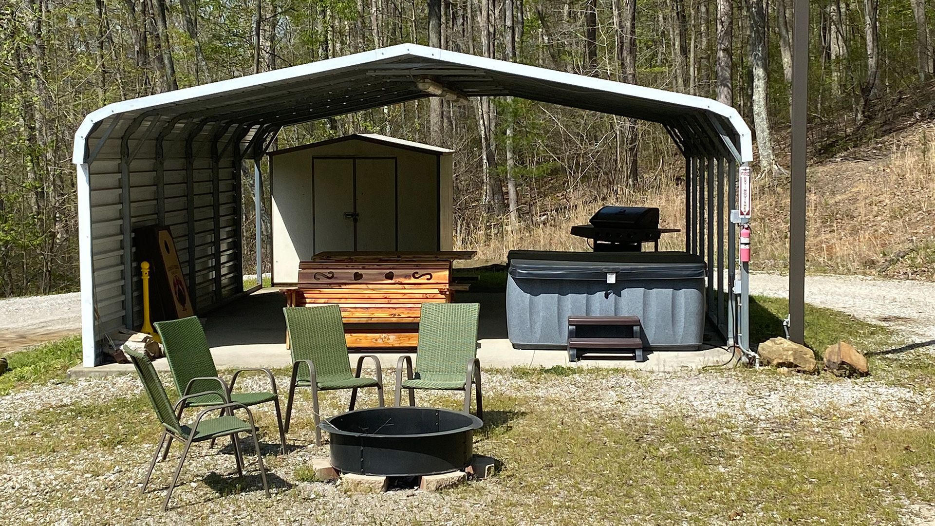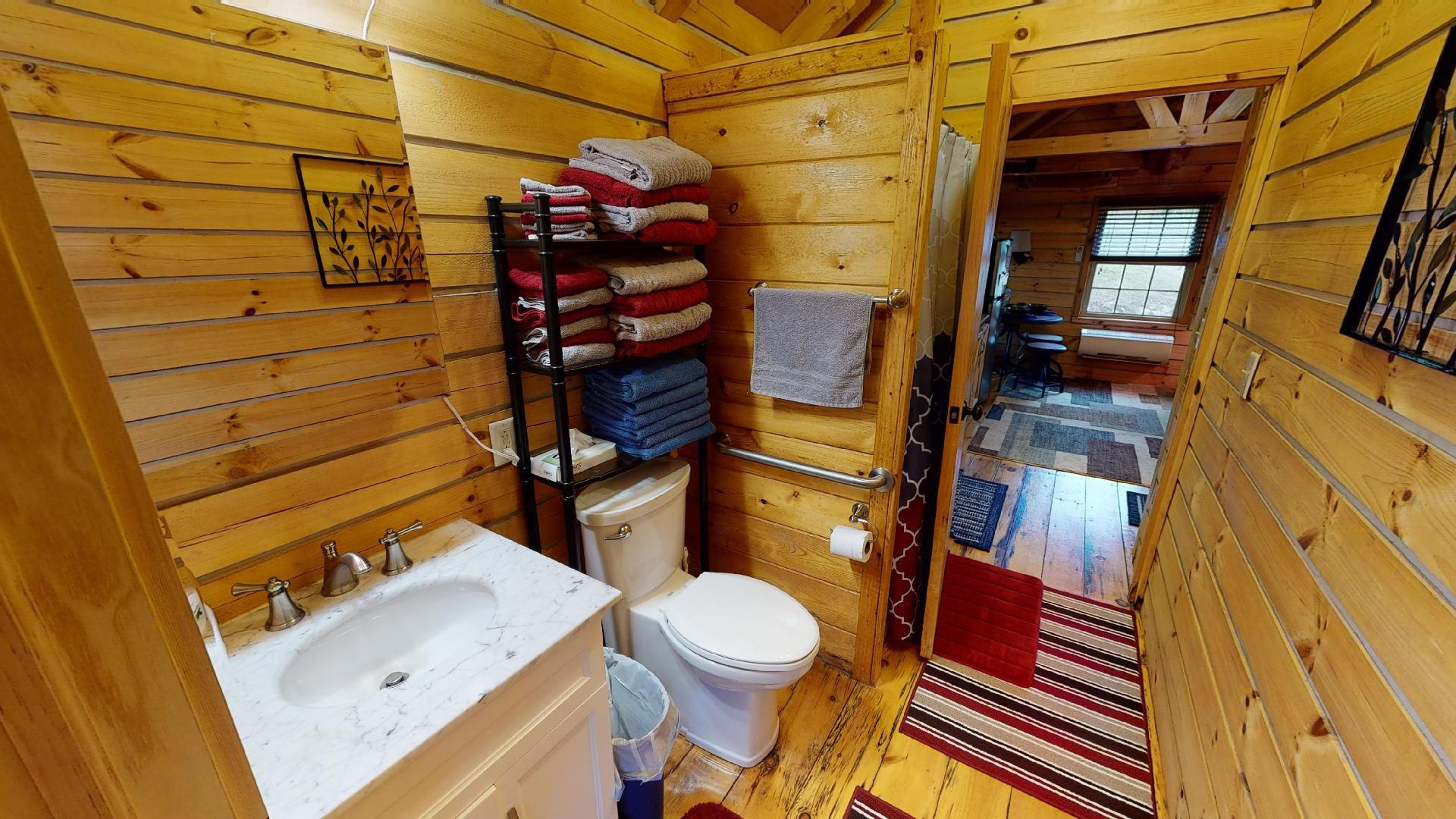 This cabin is in a private country setting with two private bedrooms (one queen and one with a twin) along with the open kitchen/living room has a futon, TV, satellite, DVD player and Wifi. The bathroom has a shower stall, a very cozy cabin to relax or enjoy the out door accommodations of a covered hot tub, gas grill, picnic table, fire ring with chairs.