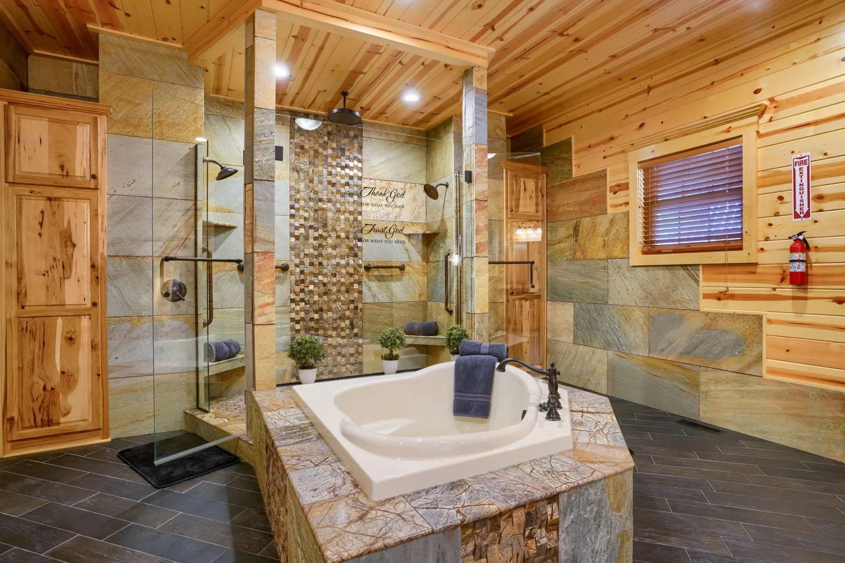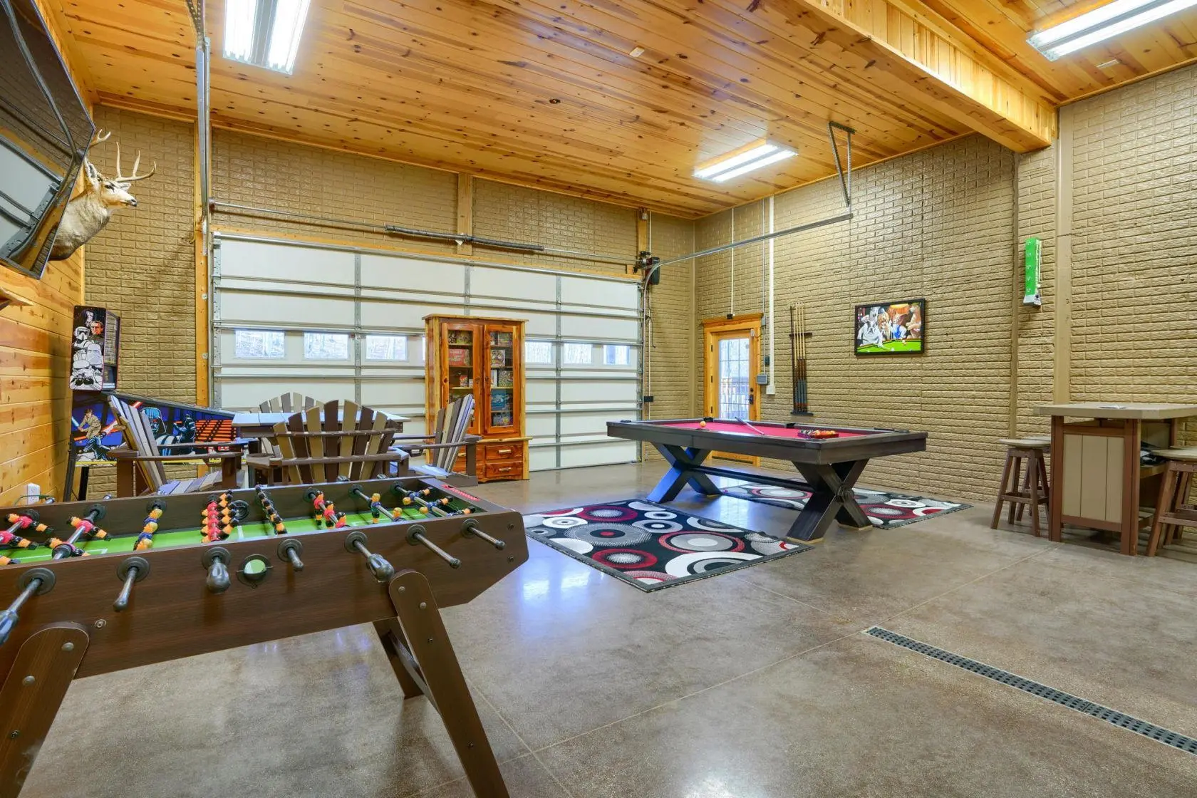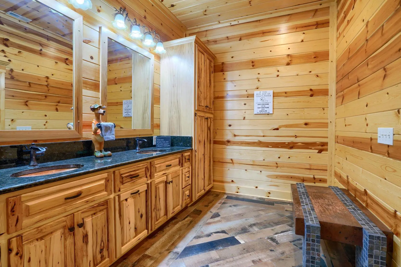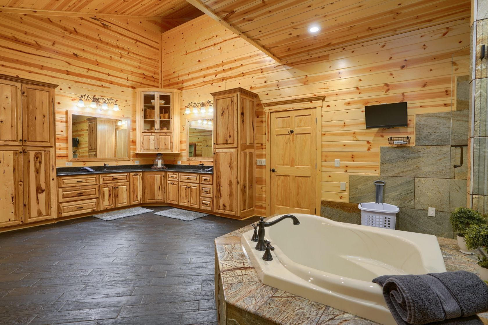 Several King beds with privacy,1 bedroom with Queen & 2 Full size on bunks, lower level has 2 bedrooms with 2 Queen beds & Queen size futon in each. Extra large custom walk in showers. Large soaking Tub, Massive parking lot for parking , WiFi, satellite TV, 2 outside fire pits with chairs, gas grill and much more - this is a MUST see. Please see for yourself on our Virtual Tour!